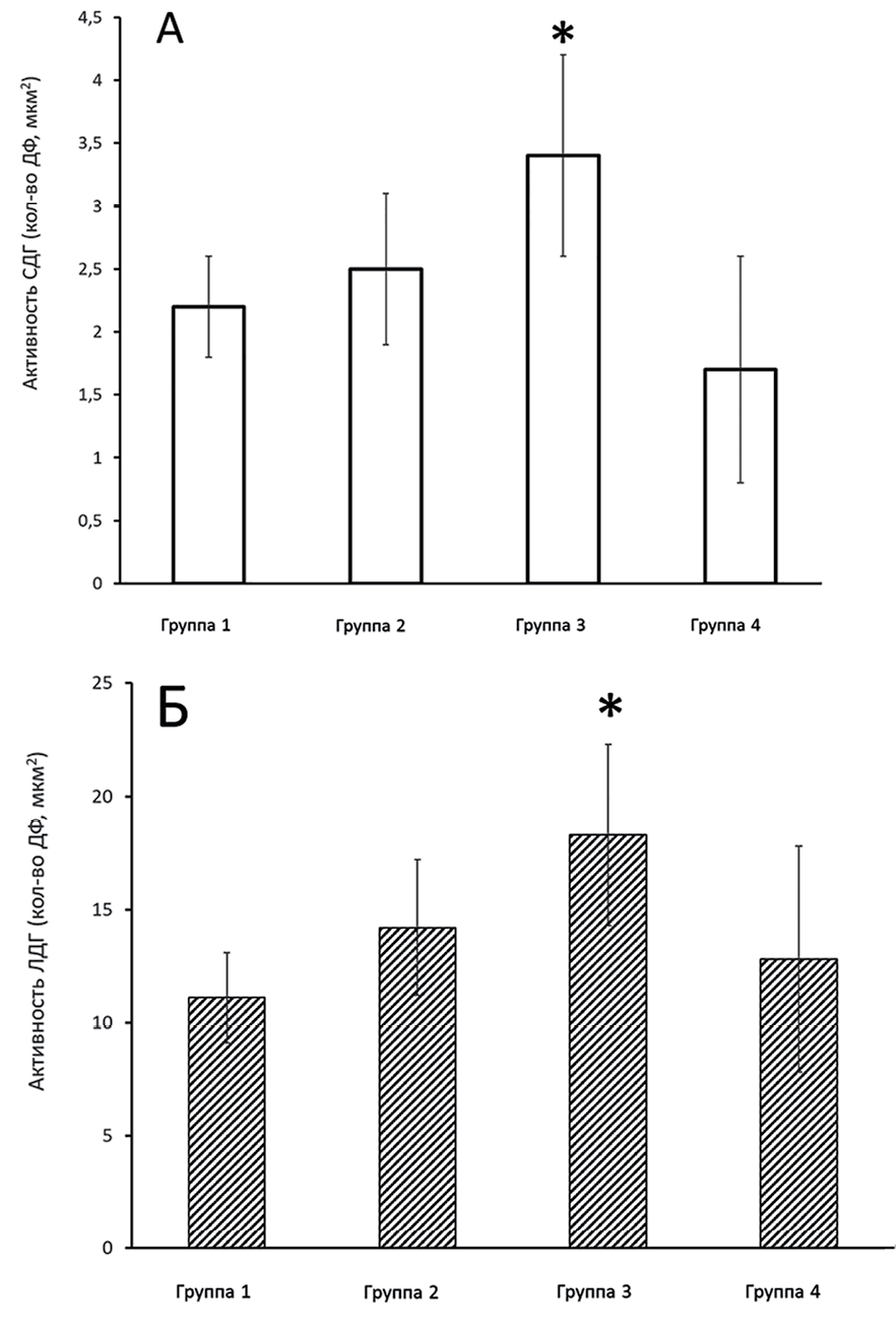 Рис. 1. Средние значения активностей СДГ (А) и ЛДГ (Б) в обследуемых группах с ОП через 12 месяцев: 1 гр. (n = 22) – пациенты 18–39 лет; 2 гр. (n = 24) – пациенты 40–59 лет; 3 гр. (n = 21) – пациенты > 60 лет; 4 гр. (n = 20) – контрольная группа Источник: составлено авторами по результатам данного исследования