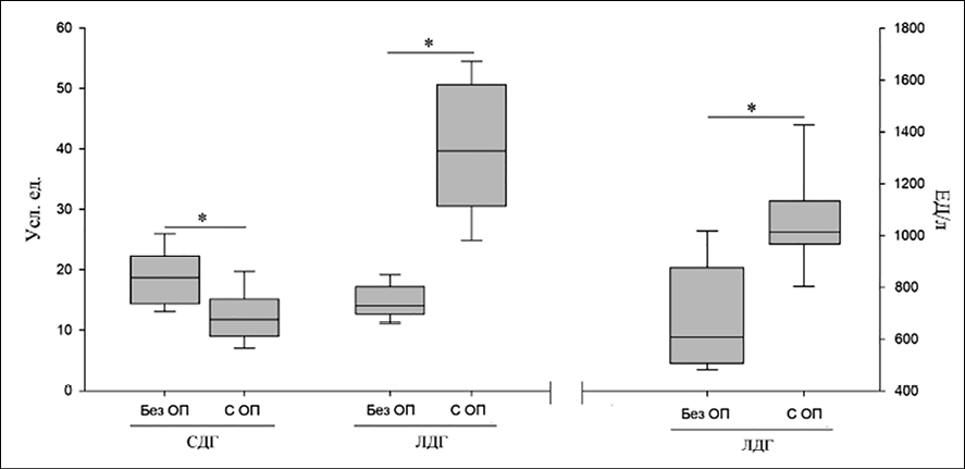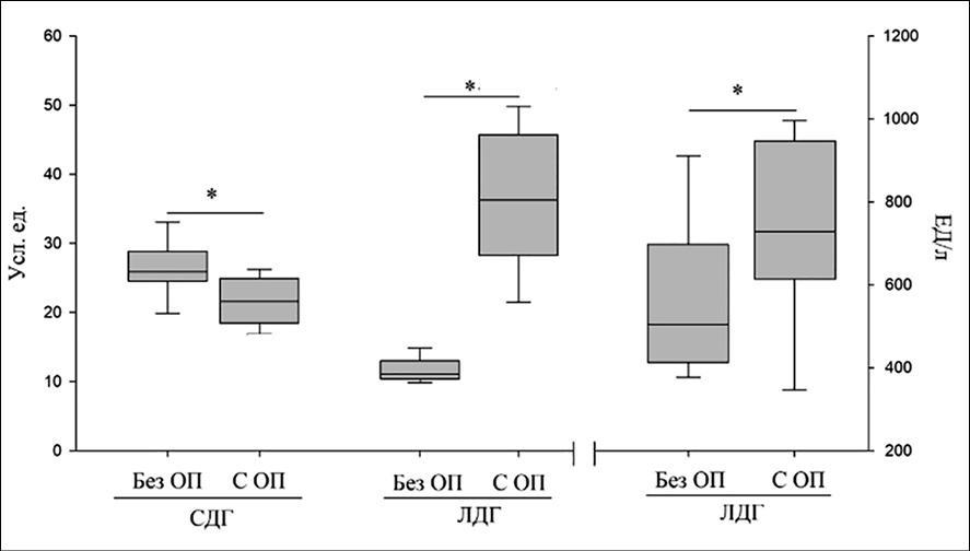 Рис. 2. Изменения активности СДГ и ЛДГ в лимфоцитах периферической крови и ЛДГ в сыворотке венозной крови у пациентов групп 1 и 2 в 2023 г. Источник: составлено авторами по результатам данного исследования