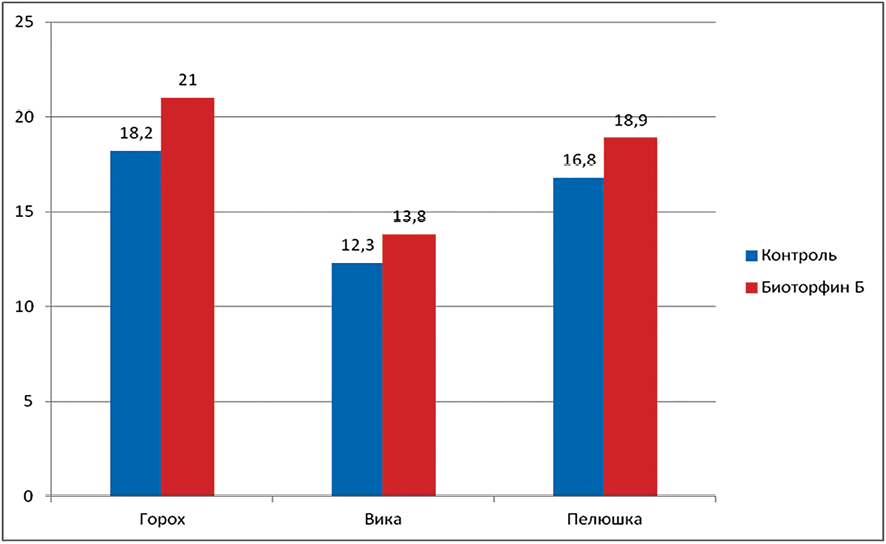 За трехлетний период исследований предпосевная обработка семян биопрепаратами клубеньковых бактерий оказала наибольший положительный эффект на урожайность гороха, увеличив ее в среднем на 2,8 т/га (15,3 %) по сравнению с контрольной группой. У пелюшки урожайность увеличилась на 2,1 т/га (12,5 %), у вики – на 1,5 т/га (12,1 %) (рисунок).