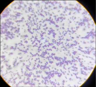 Рис. 4. Мазок колонии S. aureus из опытной серии при воздействии 5 % ДМСО, х1600, окраска по Граму Примечание: составлен авторами по результатам данного исследования