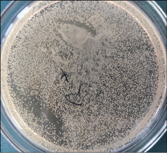 Рис. 5. Характерный «ползучий рост» колоний S. aureus (в центре чашки) при концентрации ДМСО в опытной суспензии 5 % Примечание: составлен авторами по результатам данного исследования