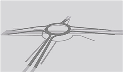 Кольцевые пересечения на разных уровнях представляют собой комплексные транспортные сооружения, в которых принципы кругового движения сочетаются с разделением потоков в пространстве. Данная модификация позволяет значительно сократить число пересечений транспортных траекторий, повысить среднюю скорость движения транспортных средств и обеспечить непрерывность дорожного движения. Благодаря отсутствию светофорного регулирования и оптимальному распределению транспортных потоков подобные перекрёстки способствуют снижению задержек и уменьшению вероятности возникновения дорожно-транспортного происшествия. Модель данной конфигурации пересечения представлена на рисунке 3.